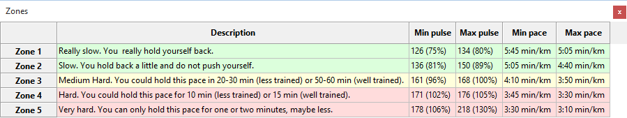 The zones pane describes the feeling and pulse you should have for each zone. To set your pulse, choose File->Pulse... in the menu. Note that the pulse you set should be your lactate threshold pulse. One approximate way to determine your lactate threshold is to run as fast as you can for 30 minutes and average the pulse for the last 3 km.